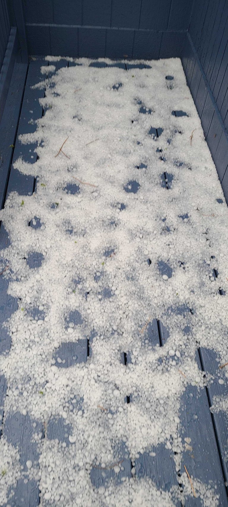 Not much sleep last night. The thunderstorm that started around 5pm last night grew big and heavy and dumped hail for over 2 hours in the middle of the night. Here's my front porch in the morning.