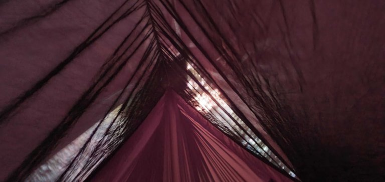 I slept in my hammock overnight and this morning the sun rose and was gleaming nice colours through the end of the hammock.