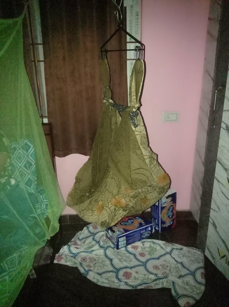 We had to create a new cradle out of an old saree. I took it right now, since I forgot to take the picture in the morning.