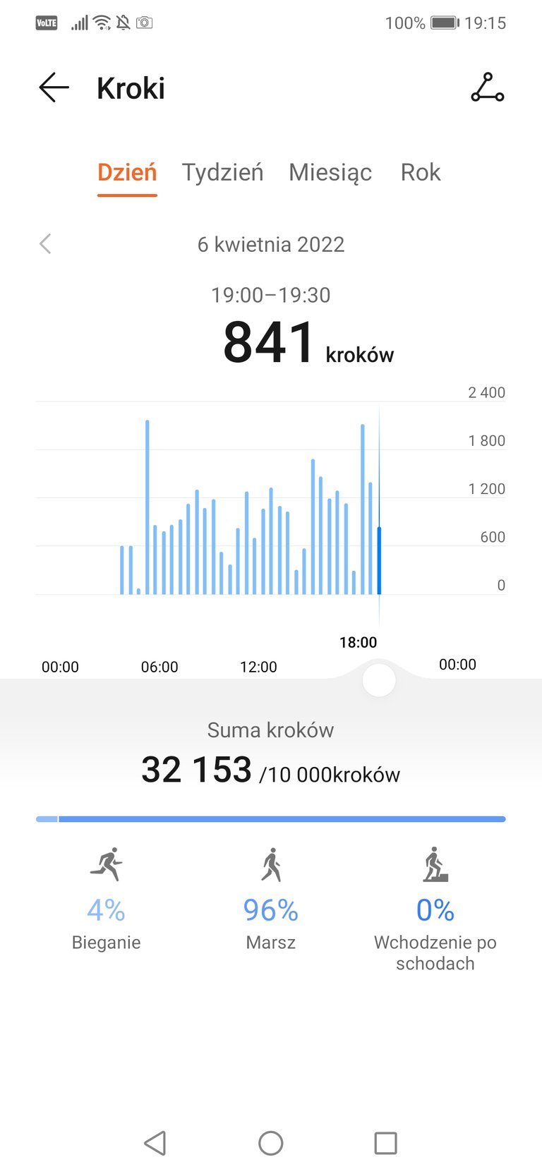 Dzisiaj miałem bardzo pracowity dzień. Średnio dziennie robię 20 tysięcy kroków, ale dzisiaj zostałem dłużej w robocie do 18:00 i zrobiłem dziś około 30 tysięcy kroków.