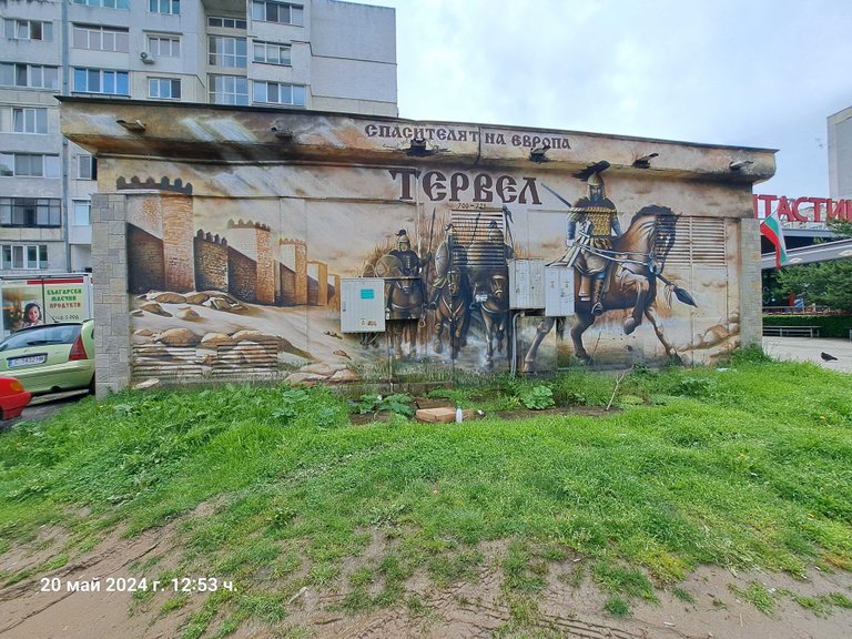 Yesterday while I was walking I saw a very nice drawing on a building of Khan Tervel, also known as the savior of Europe who is interested can read more here: