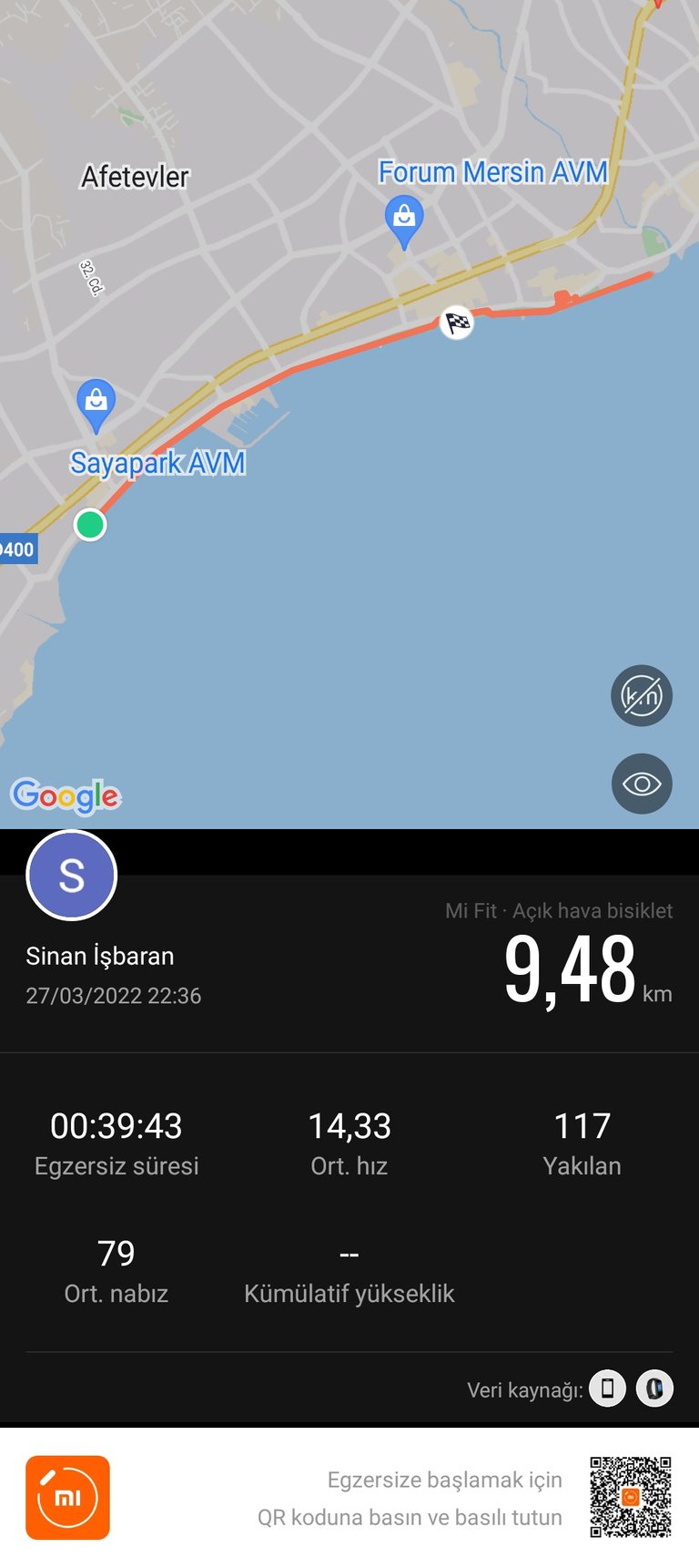 Bisiklet turumu sahilde yaptım. Yaklaşık 15 km sürmüşümdür ama kayda aldığım kısım 9 km. Bir yerde durup salıncaklarda sigara içtim.