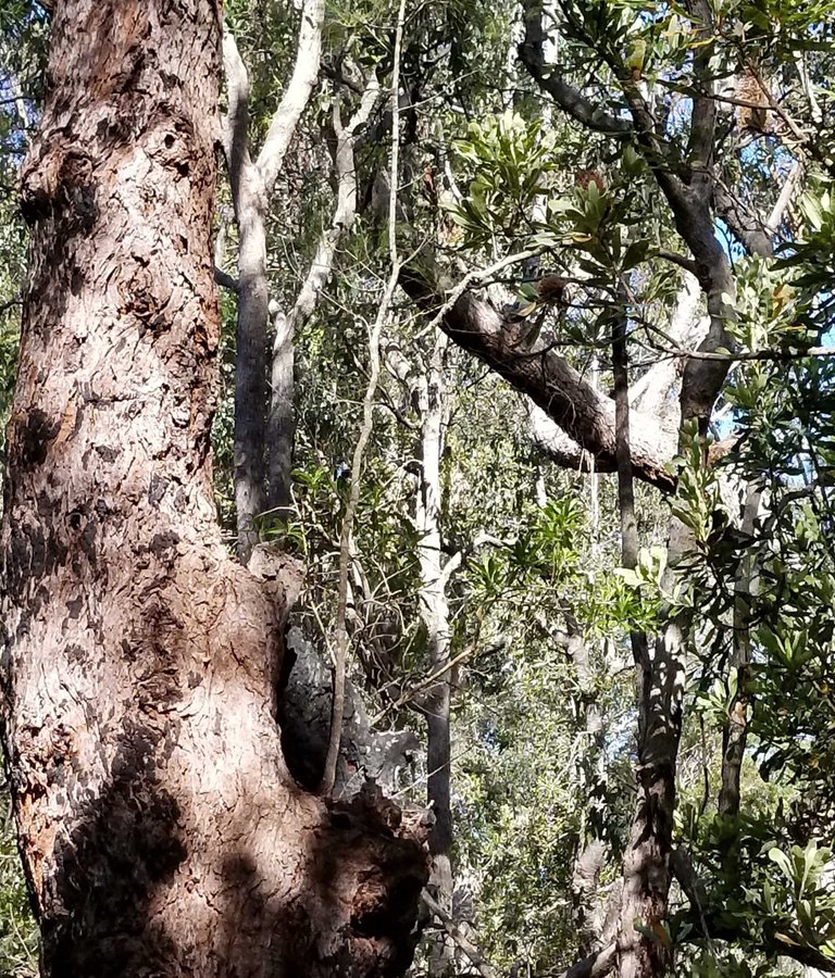 Close up study shows there is a tree growing out of the knot hole of the big tree