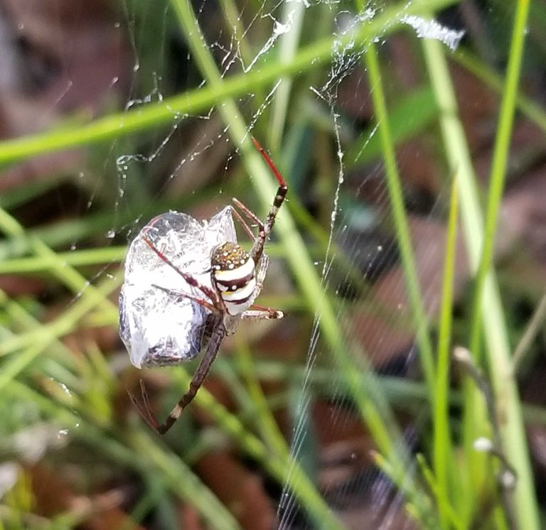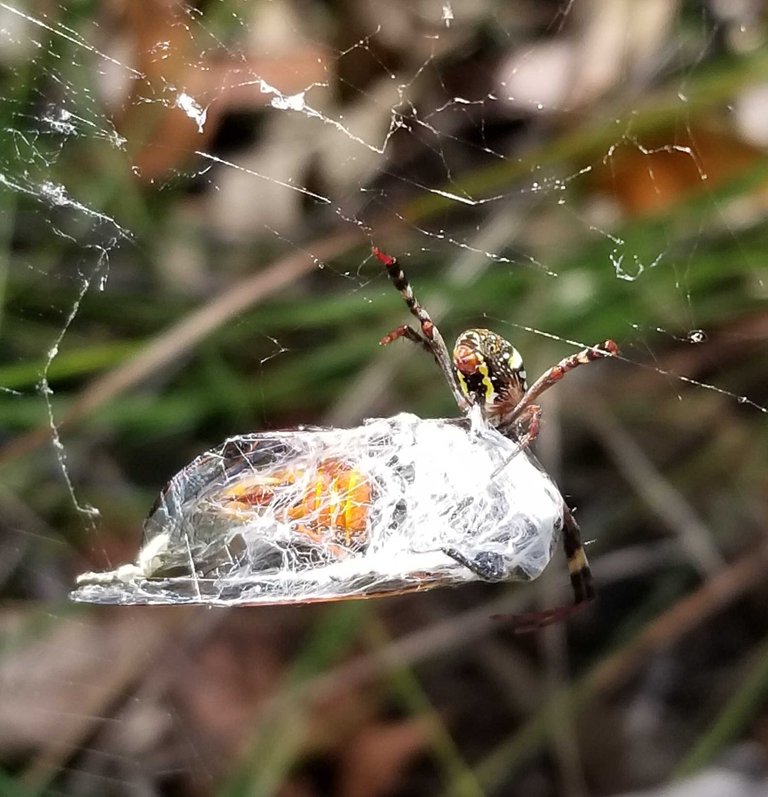 Spider has caught a butterfly - wraps it up and eat later