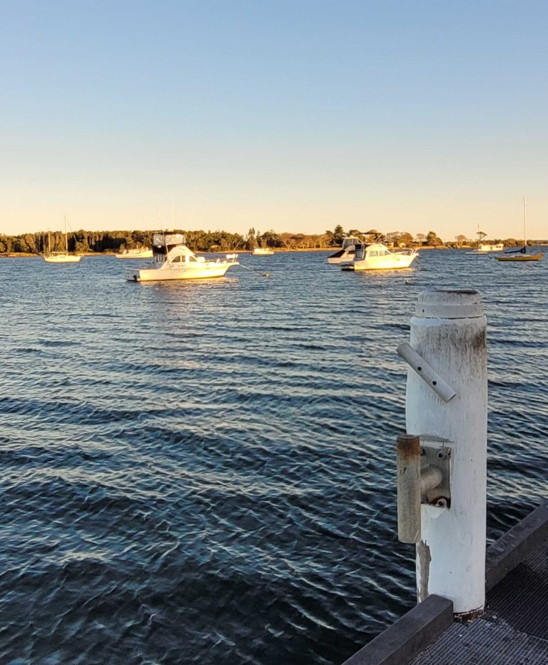 View across the river from the wharf. Note the fishing rod holders on the piers