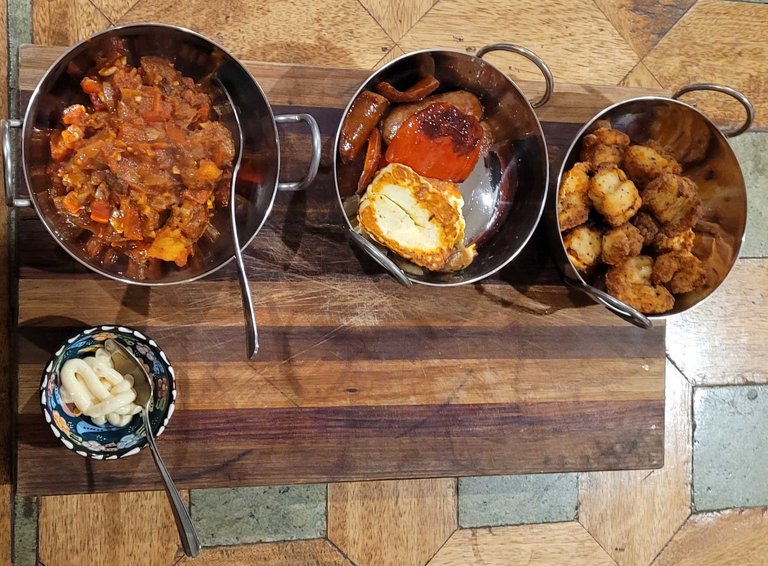 Wife also bought oysters for dinner. That for me into mini-tapas for dinner. Salt and pepper squid, chorizo, halloumi cheese, charred capsicum and patatas bravas. Small but with great flavours. Worked well