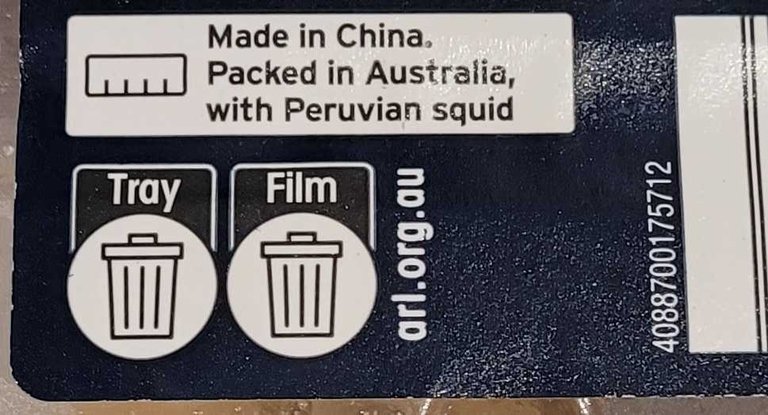 Labelling on the salt and pepper squid struck me as quite crazy. Squid fished in Peru, shipped to China for prep and then onto Australia for packaging. Worst past - the Trayning not recyclable according to the label. And then they talk to us about a climate emergency.