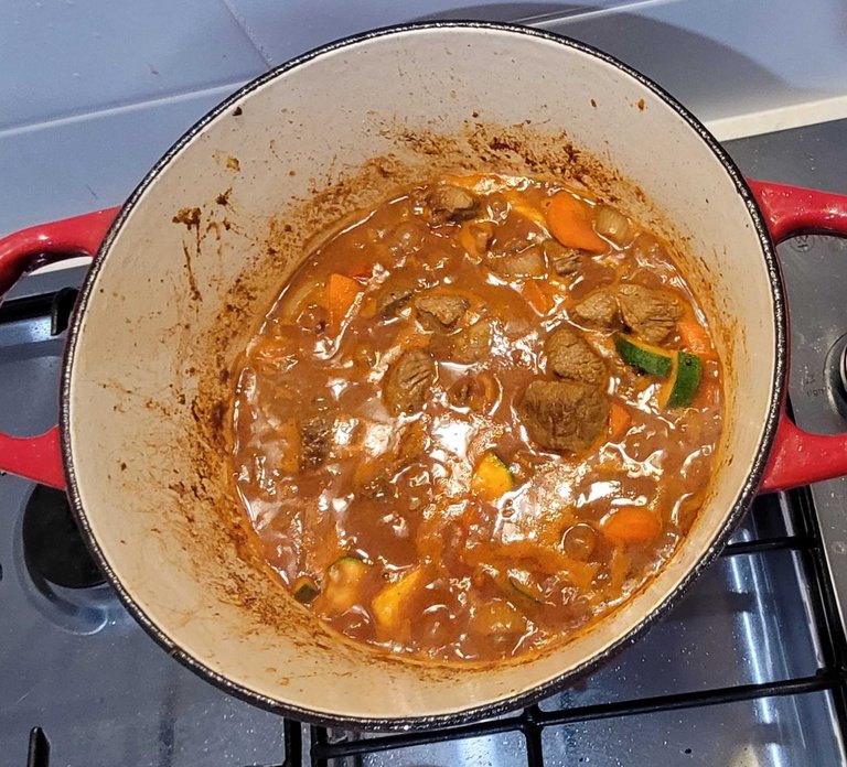 Brown the meat - soften the veges - add a little white wine and stock and tomato passata. Add the meat back and bake for 45 minutes at 180C