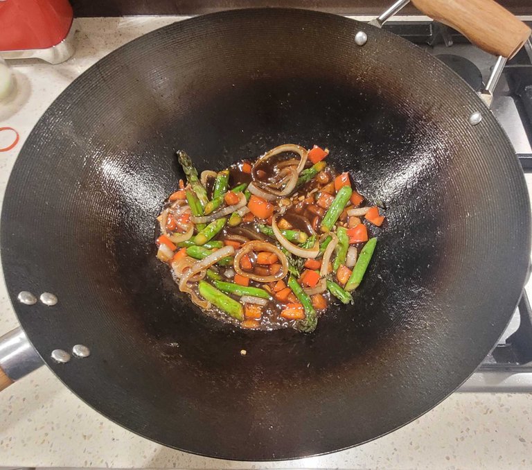 Stir fry beef which has been soaked in rice wine and soy sauce and black pepper. Set aside and then saute onion, garlic, capsicum and asparagus cut on the diagonal