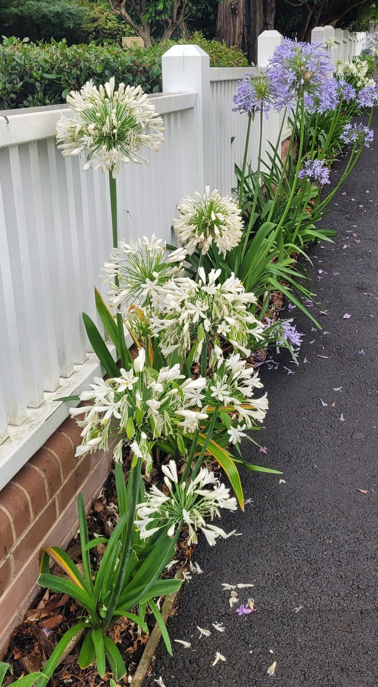 The flower theme is also a summer story - a line of white and purple agapanthus along this fence