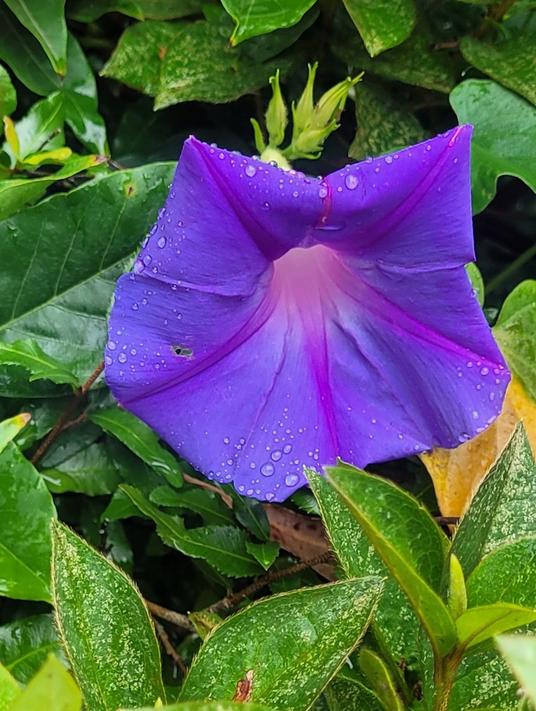 More raindrops on the morning glory flower - a weed that spreads everywhere