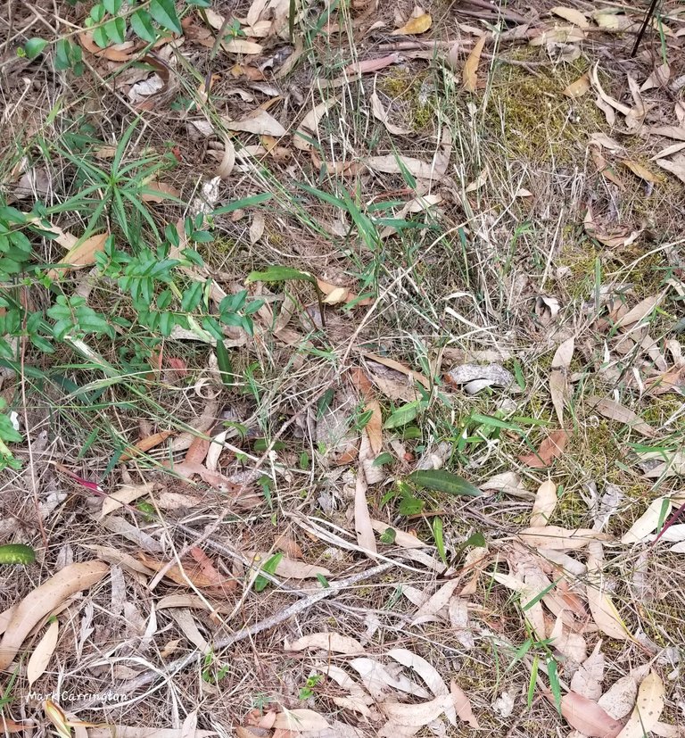Found a cluster of cryptostylis leaves before hitting the park boundary. All spikes seeded - cryptostylis subulata - green backed leaves