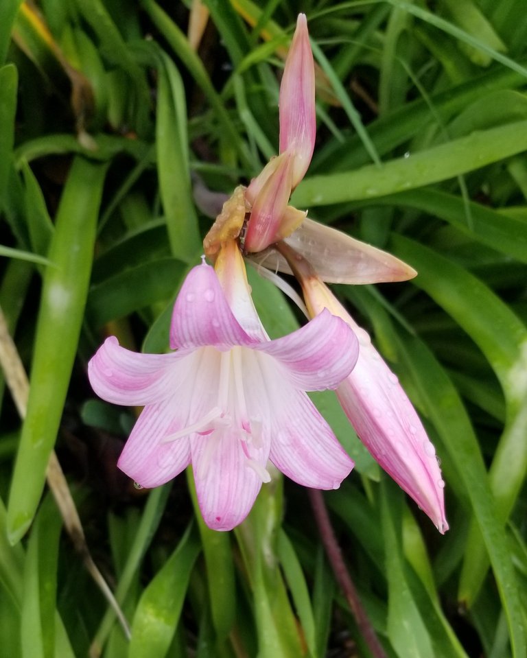 Got to walk somewhere on an umbrella walk toward Richmond Park. Naked lady lily on the way with raindrops