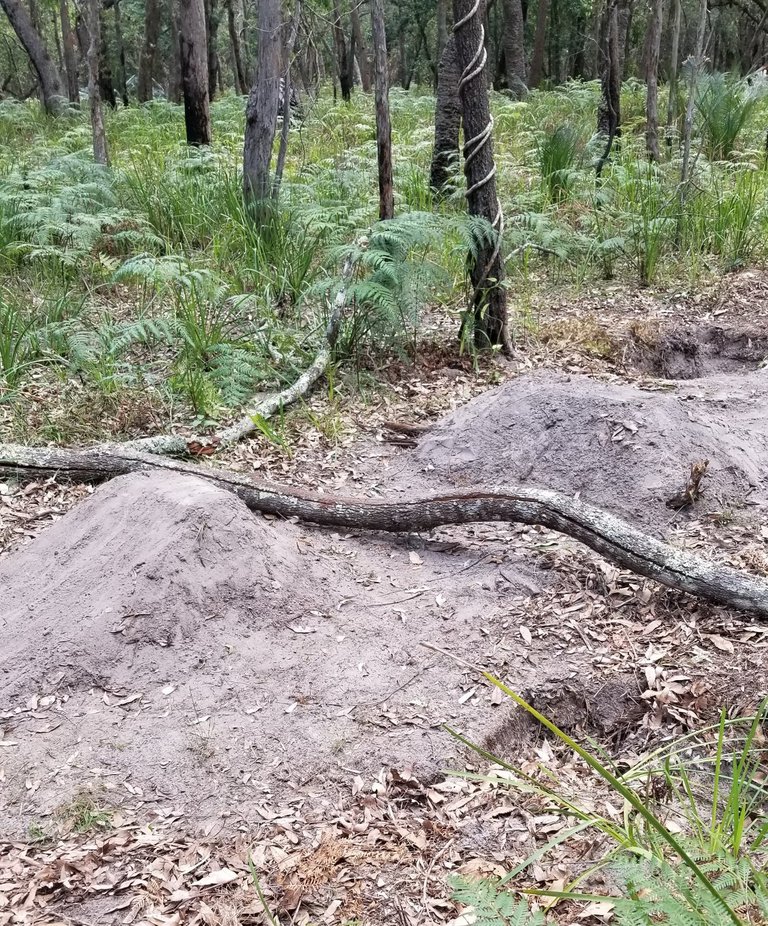 Walked down the main access track hoping to find chiloglottis seminuda in a few know spots. Their season is beginning. Photo tells me that school holidays are here. The kids have made ramps - this one to cross a fallen tree. Quite a few ramps made - deep enough to break a fire truck axle