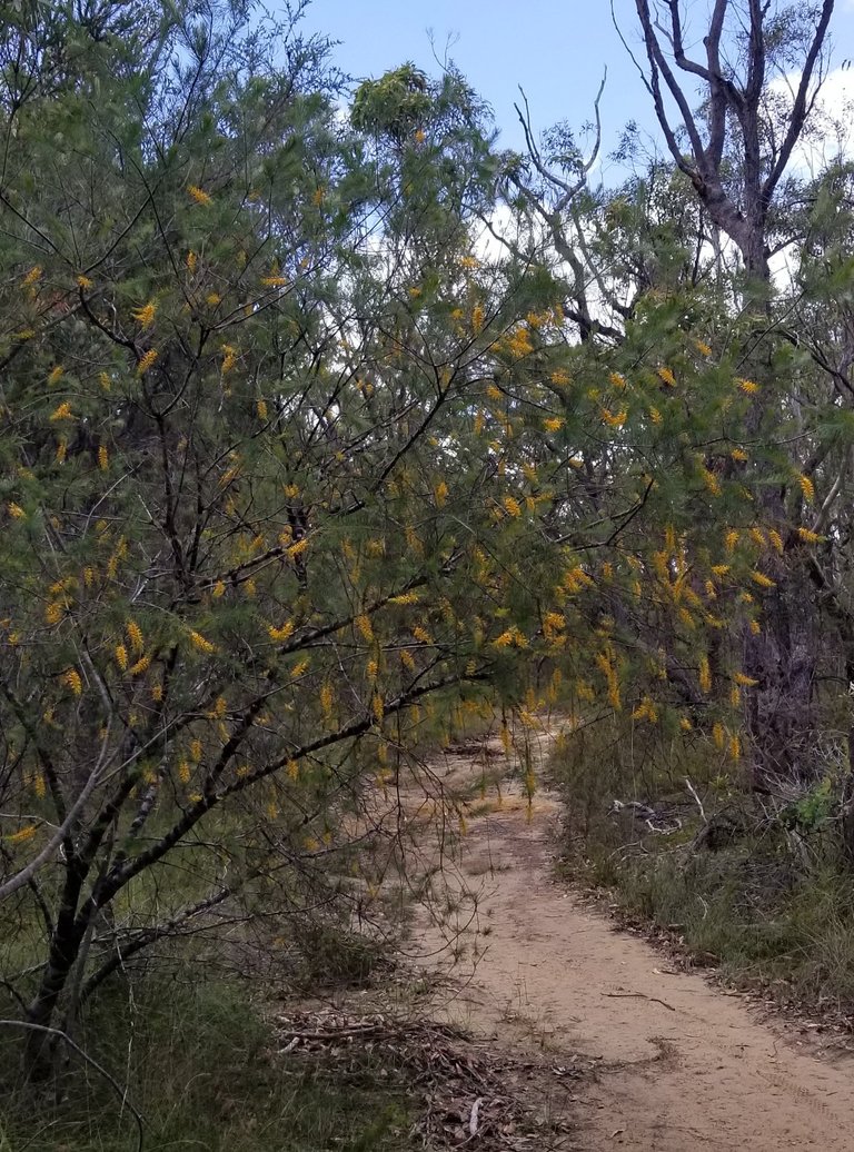 Stepped back photo of pine-leafed geebung across the track