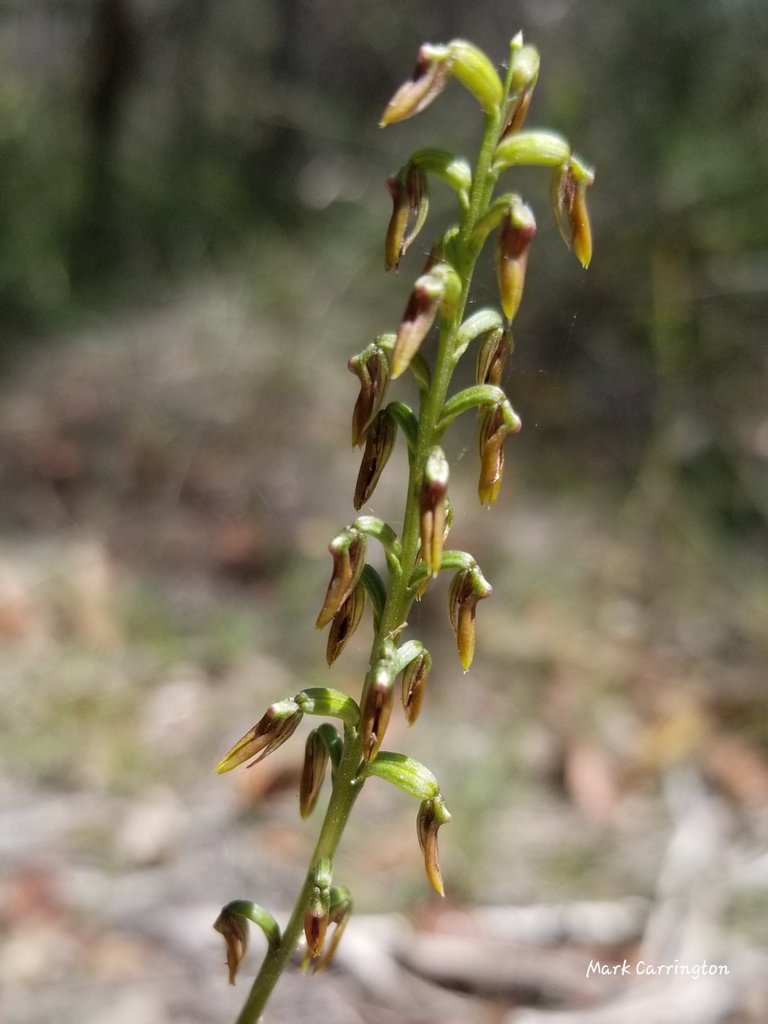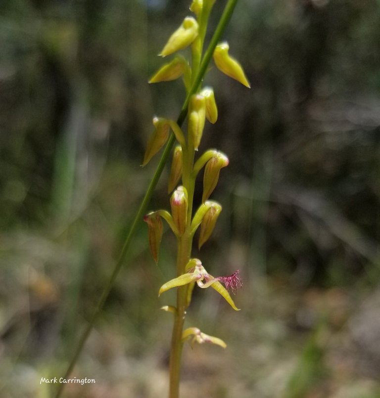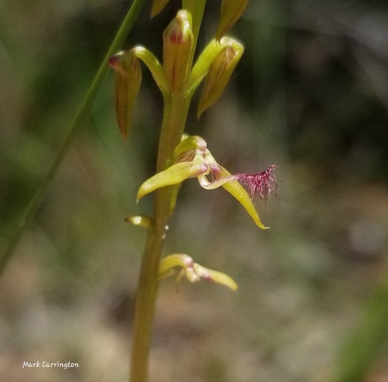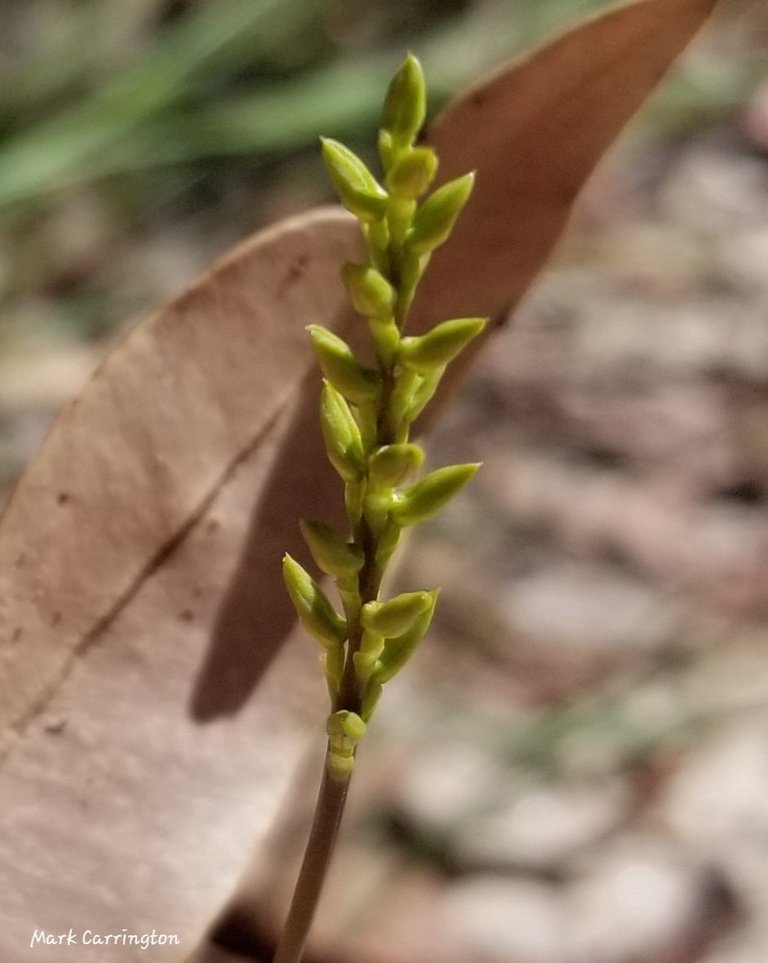 A little further on was one flower open. They flower from the bottom - one flower open. This orchid has a flappy labellum - happy to get a shot of the tiny labellum in focus