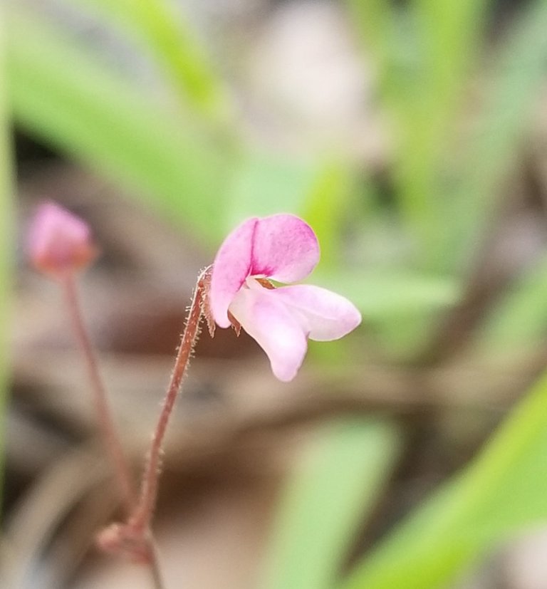 Seen a lot of these little pink splashes. Got down low to take a shot. It is a tiny pink pea flower - the size of a match head . Glad I stooped low