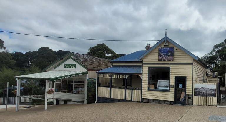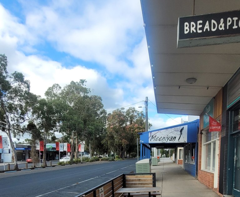 Showered and walked back to town to buy provisions for tomorrow. A fee streetscape shots - sign and towering gums