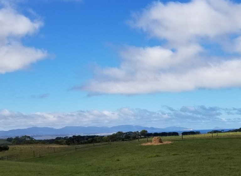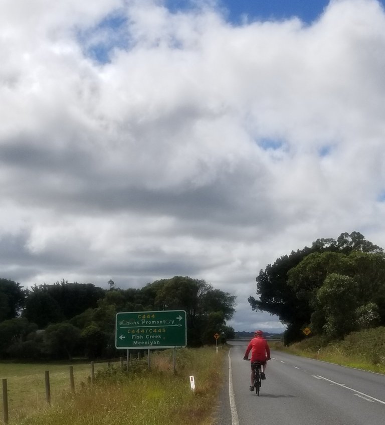 Downhill to Walkerville - we skipped riding down to cafe there as it is a steep climb back out. Wait till we reach Fish Creek for lunch. Fab views of Wilson's Promontory as we cycled away from the coast with Cape Liptrack NP on the sea side