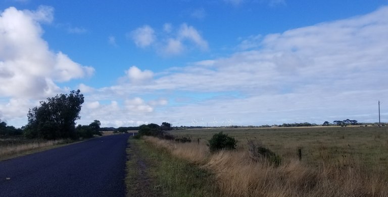 Slight incline on the drag away from the sea to the ridge line ahead - where the windmills are - did go for a while before we passed the last of the windmills