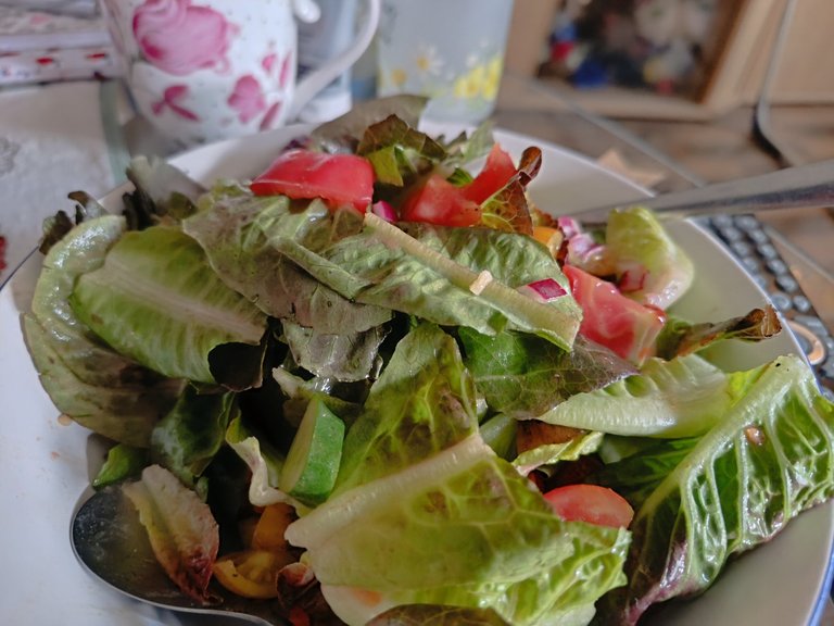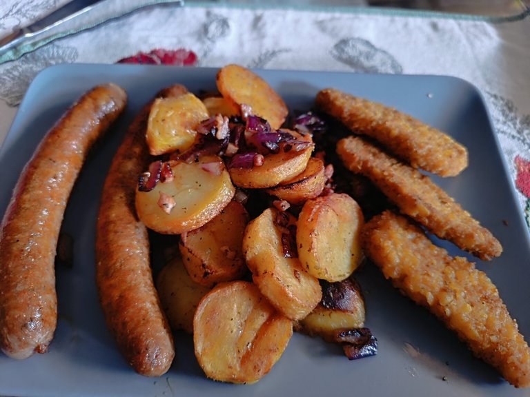 After the gym I started to cook. You see the photos at the top of the post. Fried potatoes with onions and bacon, mergues sausages and vegan crispy sticks. The salad was made with things from our field. So good.