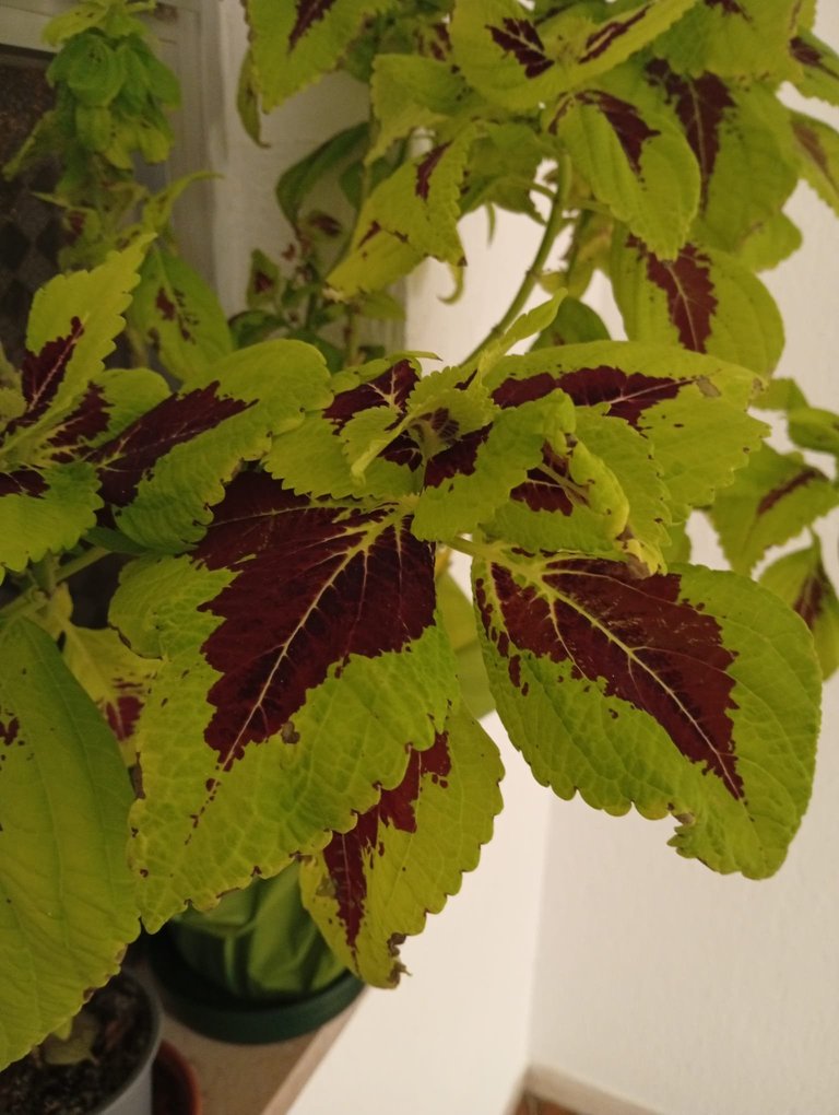 La pianta mostrata nell'immagine è un Coleus, noto per il suo fogliame decorativo e colorato È una pianta tropicale perenne. Questa pianta predilige luoghi luminosi per mantenere i colori vivaci delle sue foglie, ma non esporre al sole direttamente nelle ore più calde per evitare bruciature. Cresce ugualmente anche in mezz'ombra, non tollera temperature inferiori ai 10°C. Durante l'inverno è consigliato tenerla in casa lontano sia da correnti d'aria che da fonti di calore come stufe e termosifoni. Il terreno va tenuto sempre umido ma non inzuppato ed evitare ristagni idrici nel sottovaso.