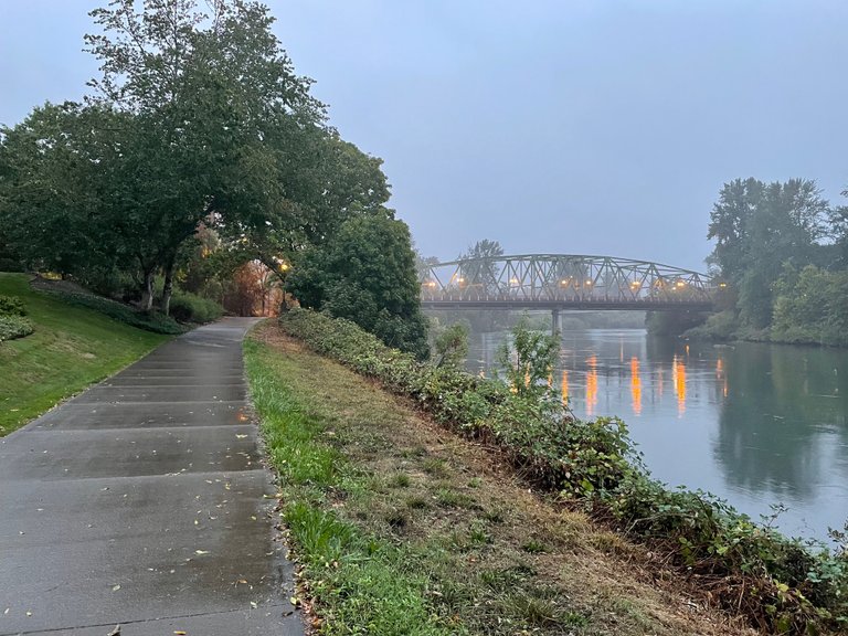 I took my morning walk along the riverbank path to Alton Baker Park and back. There was a light misting of rain for the whole walk. Later in the day I walked to the grocery store and back.