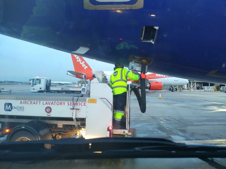 A view out of the truck window while waiting to cater an A320. We always allow the toilet waste bowser to clear before we attempt our final approach! For obvious reasons, a leak could be disastrous for me guiding the truck forward! 🤣 You can just see the bottom of the door in the picture.