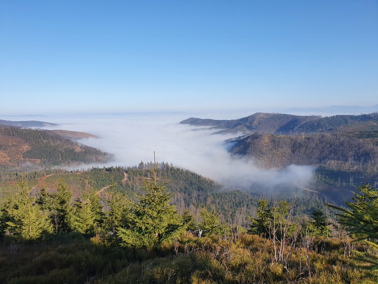 A wyżej było już tylko lepiej, aż w pewnym momencie weszliśmy ponad poziom zawieszonej mgły. Niczym w jakiś magiczny sposób, na szlaku nagle pojawili się inni turyści, tak jakby coś przyciągnęło ich w stronę słońca. Już wkrótce mogliśmy w milczeniu podziwiać doliny zalane mgłą niczym mlekiem. Górskie szczyty przebijały się gnieniegdzie, jak wyspy na morzu. Coś pięknego, w moment przypomniałem sobie, za co kocham górskie wędrówki. Kontakt z przyrodą, widoki, walka ze swoim ciałem i zderzenie z głową.