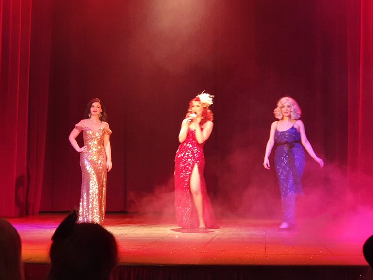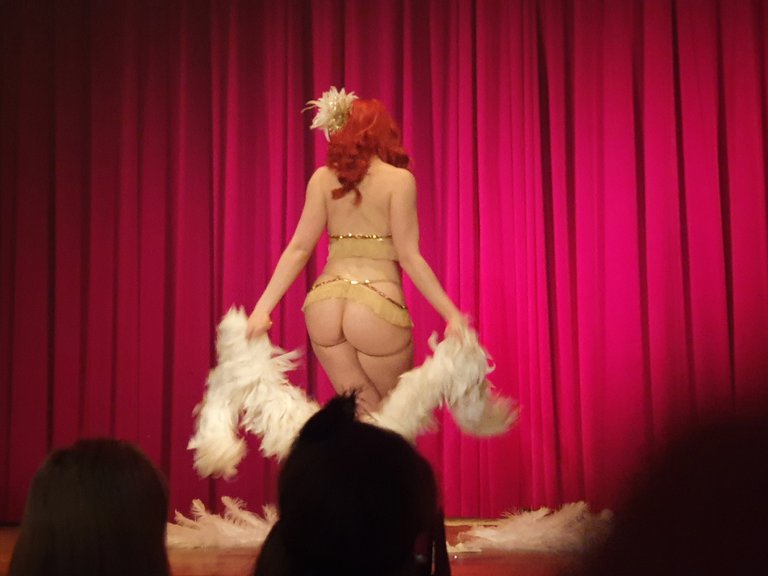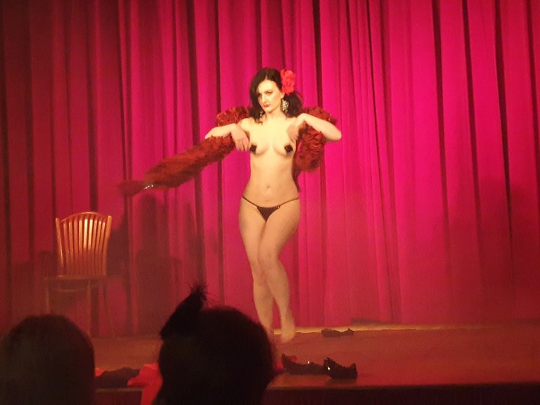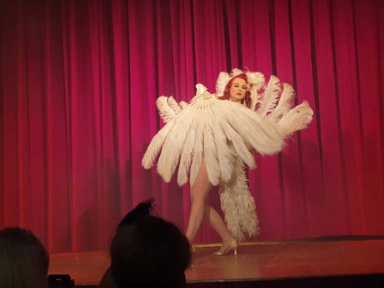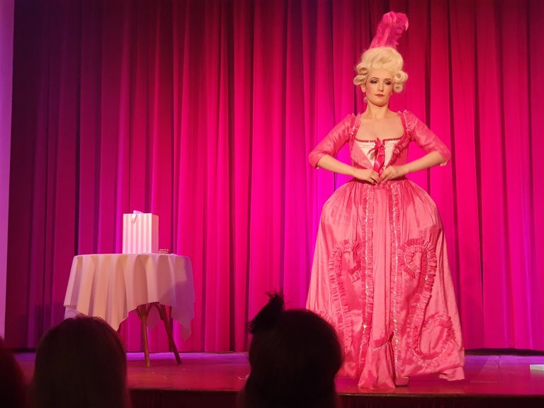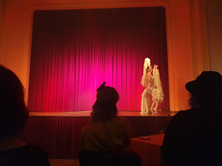 Zarezerwowany mieliśmy stolik numer 8, w drugim rzędzie, ze świetnym widokiem na scenę. Na początku konferansjerka opowiedziała nieco o burlesce i jej historii.