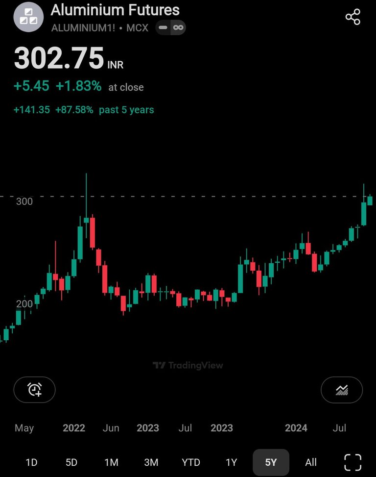 Check out this aluminum futures chart!! This 5-year chart shows the highest we reached back during covid, when the global supply chain put a squeeze on aluminum! Or when building material shot up during covid. Now aluminum is reaching for all time highs.