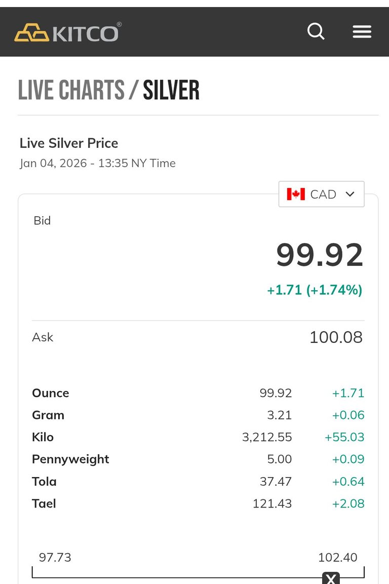 Lots of theories going around about Silver on the internet! Price is way up and a lot of bulls are coming out of the wood work! Silver close at $72.82 USD this past Friday. In my country's currency, the Canadian dollar! It closed just shy of $100 CAD.