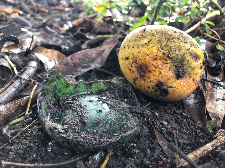 And to go with a blast I end my report with a shot of a piece of broken glas, part of a billion pieces more found on a former trash pile I’m trying to convert to a compost bin and a half eaten mango (probably a bat, a bird, a eguana, possum or some of our neighborhood friends and family members of master Splinter)