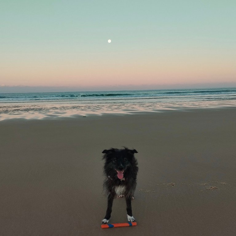 Great start to the day. Minty got me up and out in time to see the pink of sunrise and the not-quite-full moon (in the picture). We walked along the beach and then back for a few exercises and then breakfast.