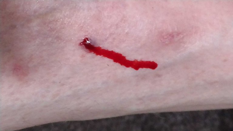 Got a huge load of grain first thing this morning and emptied it right away. Got most all the mowing done before the rains hit. First stepped on a hawthorne throne that went through my shoe into my right big toe but I got it all out in one pull. My toe is still sore. Then this was a rock that got flung back and smacked my shin and the impact was quite hard. Surprisingly it didn't bleed excessively. Now it is DUMPING rain again and will be for hrs with over 1/3" so far.