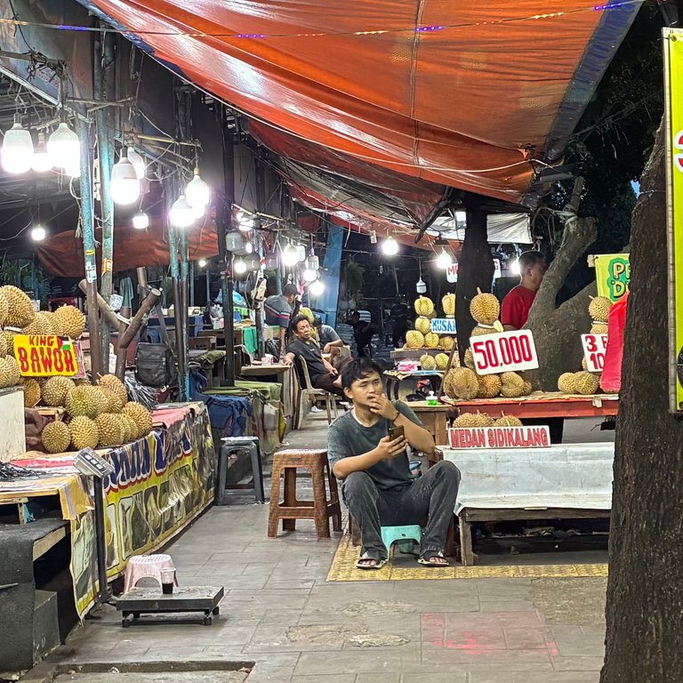 Along the way, I passed a durian seller. Of course, I had to stop and look. The scene felt very Indonesia, I mean, the seller was smoking, sitting casually, with an outdated haircut that probably hasn’t changed since the early 2000s. Around him were stacks of durians, strong smell included, with handwritten price signs that looked older than my phone.