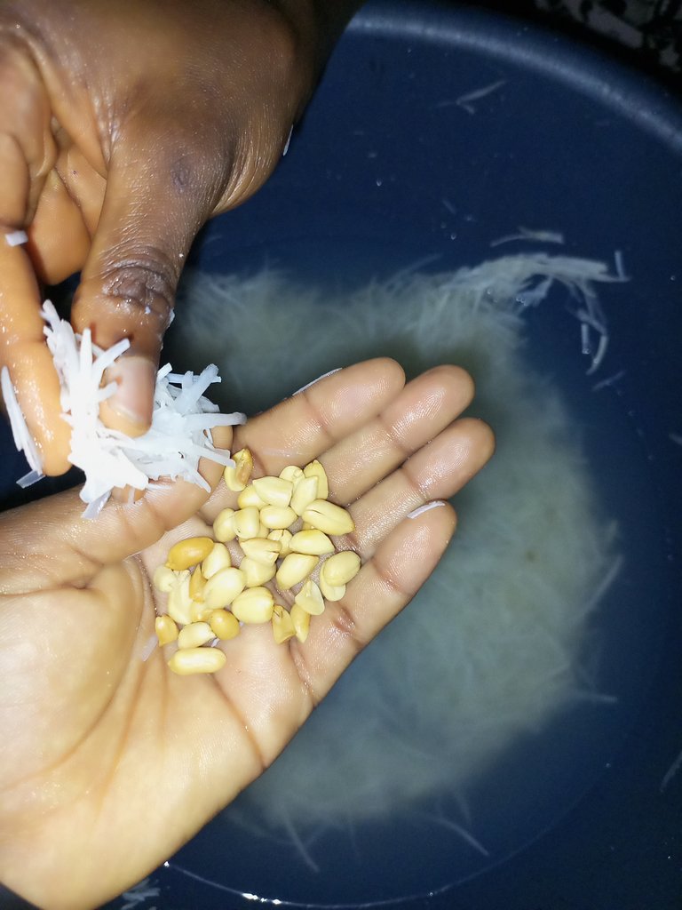 The first time I ate it with mkpomu(cow skin) mixed with pepper, oil, garden egg and sauce, but today I had to eat it with coconut 🥥🥥 and groundnut. It was too delicious and tasty 😋😋😋.