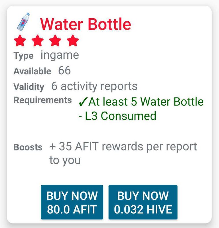 I bought a level 4 Water Bottle for 80 AFIT Tokens to get more +35 AFIT Rewards per report.