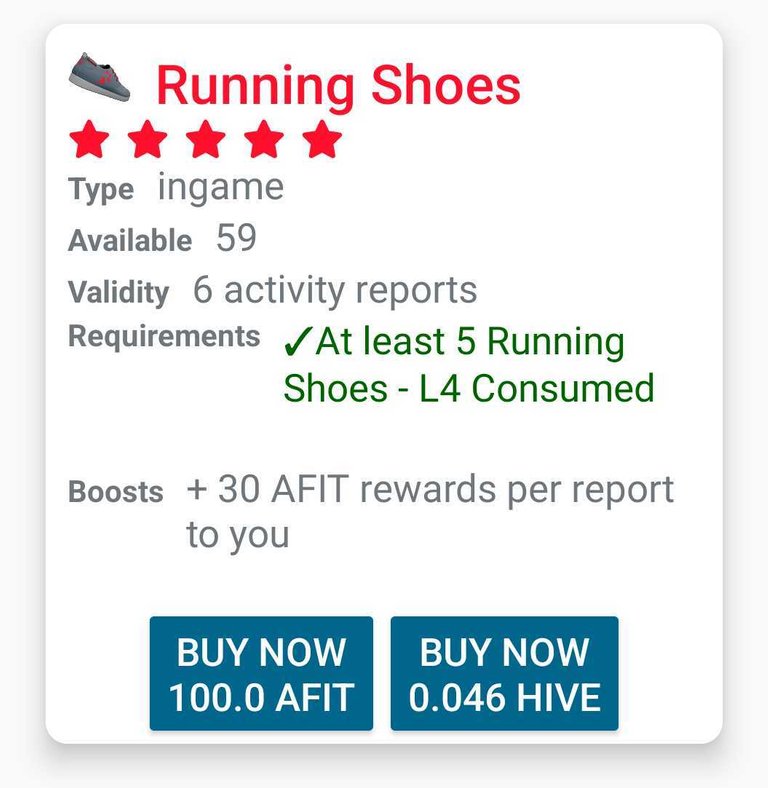 I bought a level 5 Running Shoes 👟 for 100 AFIT Tokens to get more +30 AFIT Rewards per report.