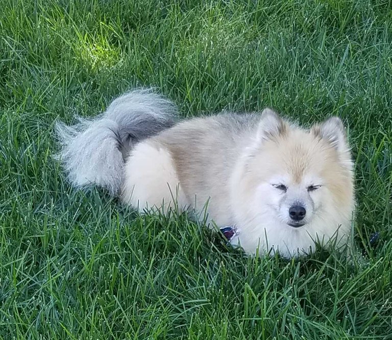 Brownie took me out for a walk early in the morning and again a few hours later. But by then, it had warmed up quite a bit. So instead we laid on the grass under a shade tree. Brownie really wanted to go for a walk, but in the end a nap seemed like a better idea.