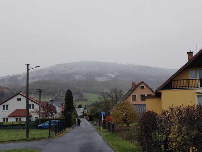 Pouze část kopce Biskupská kupa u Zlatých Hor byla v neděli zasněžená, ve městě se sníh neudržel.