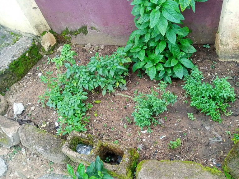 In this small garden, we have bitterleaf, curry leaf, pumpkin leaf and pepper.