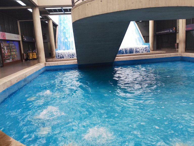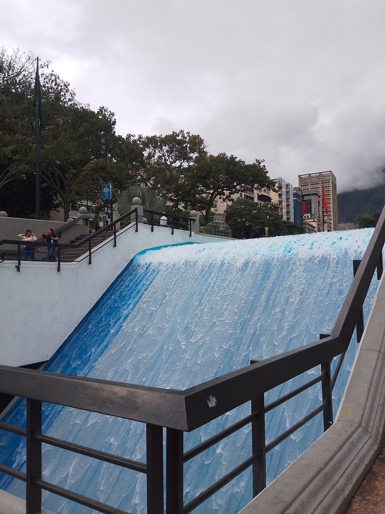 Un Regalo Por Mi Caminata Una agradable caminata por el este de la ciudad; esto hace mi actividad más placentera, este día un poco húmedo, por amenaza de lluvia, pero fresco. Mi marcha, después de hacer algunas diligencias que me mantuvieron ocupada toda la mañana, hace que tome un respiro y me recree un poco la vista. Luego de dejar el metro y seguir hacia la salida, comencé a escuchar el sonido vibrante de la cascada, ubicada en ese espacio que se enlaza con la estación del metro y la plaza, como un monumento llamativo para los usuarios y visitantes.