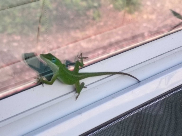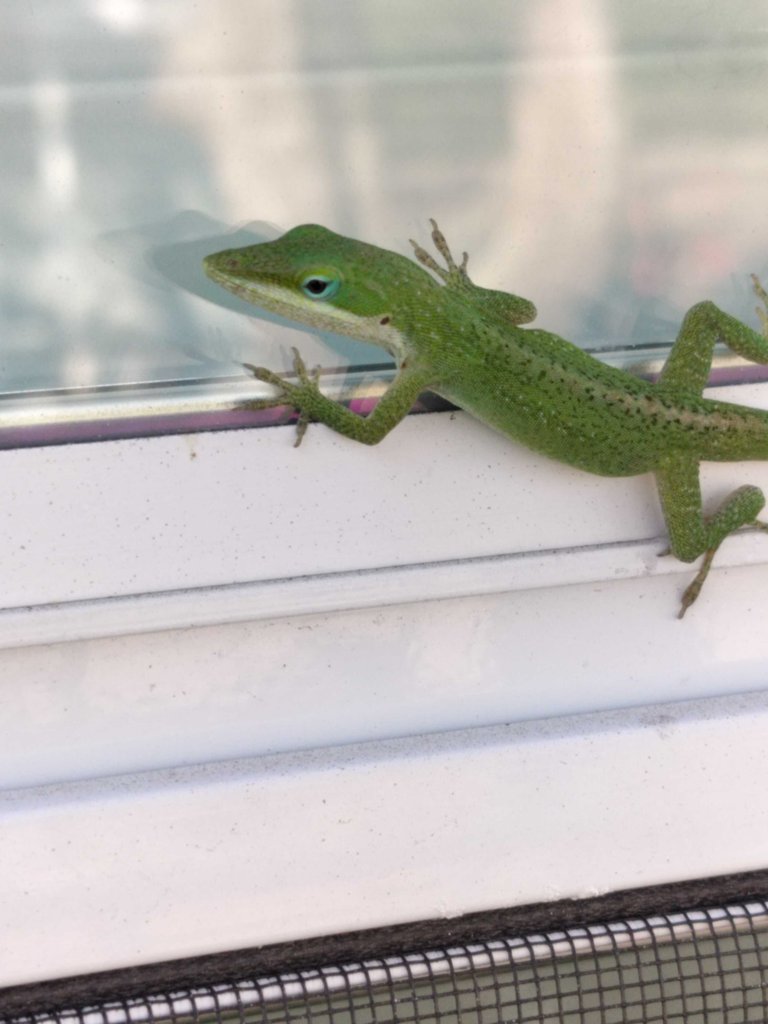 After awhile out there I rode back to my house. When I got there I found the Anole hoping around the plants. Here it is on the window,
