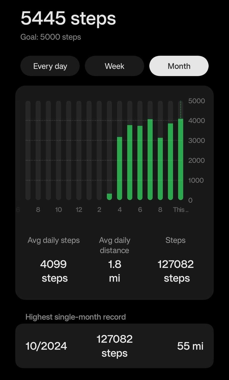 I had a few other goals going on at the same time. Besides the "5000" step count, I also had a monthly step count going on where I wanted to beat my previous high month "step count" - "I did"!
