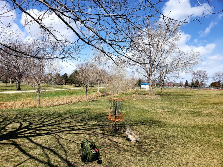 I played one very windy round of nine hole disc golf today. The score was a seven over par. I threw a disc into the ditch but managed to get it back easily because the water was very low.