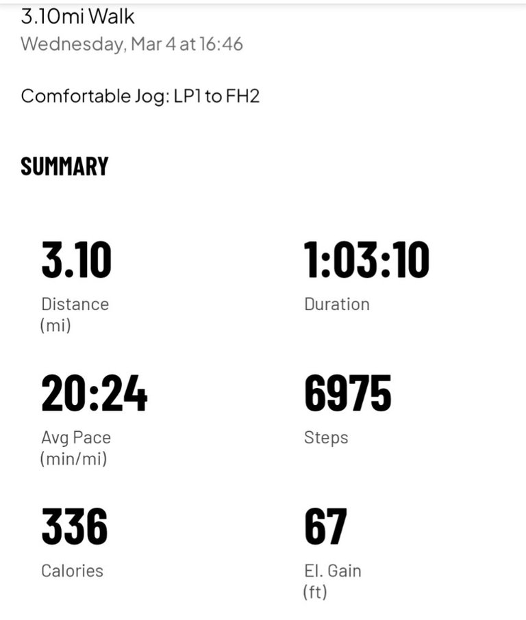 Busy day but was able to get a walk before too dark. Surprised at the first 2mi pace. Comfortable Jog: Light Pole 1(LP1) to @Fire Hydrant 2 (FH2).