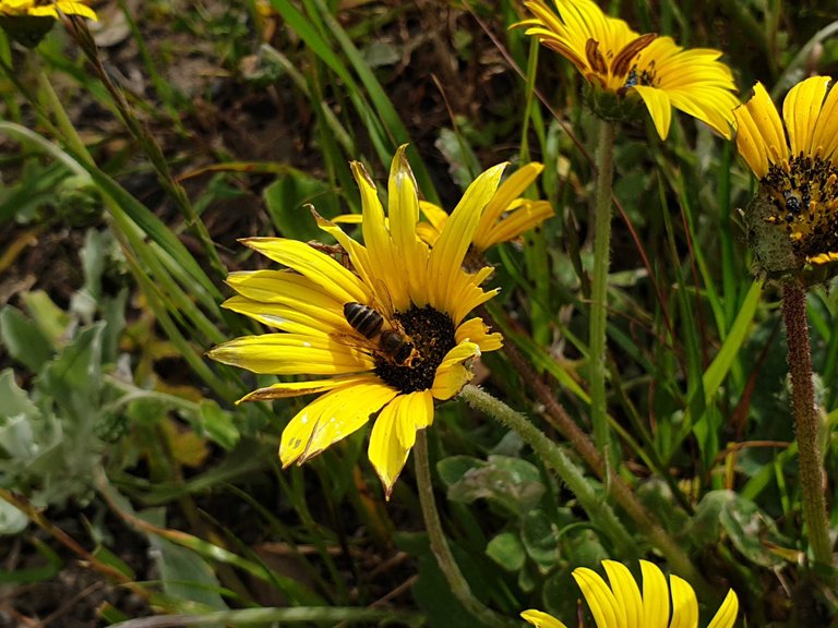 Along the way, I was greeted by a most beautiful spectacle. It's no secret that I have a particular fondness towards cute little bees. Here was one, enjoying foraging for pollen and nectar. I suspect this bright yellow flower (which I assume to be some sort of weed), fulfilled this purpose rather well.