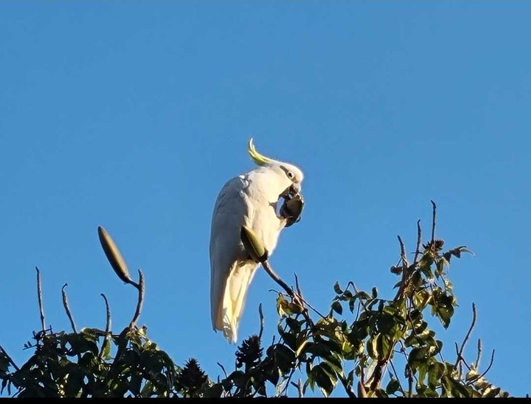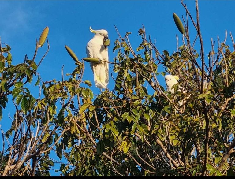 A pair of Sulphur crested cockatoo's feeding high in a tree in on our afternoon walk. These birds seem very smart, the way they crack open seeds and are always a pleasure to watch. The second bird is hard to make out just behind the branch to the right.