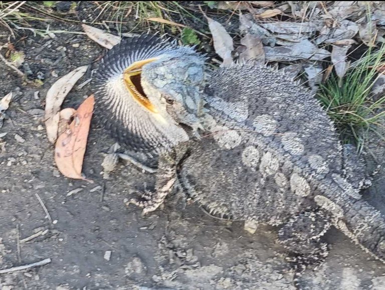 I got a but closer for a better photo and the lizard started to puff it self up defencely. As I moved along the path, it opened its mouth like it was going to attack, but he or she just rolled it head as I passed, keeping a close eye on this weird human out jogging with his camera phone.